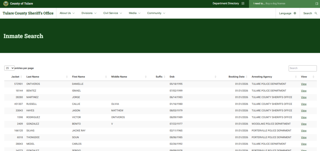 - Mugshots, if available through the Tulare County Sheriff’s Office