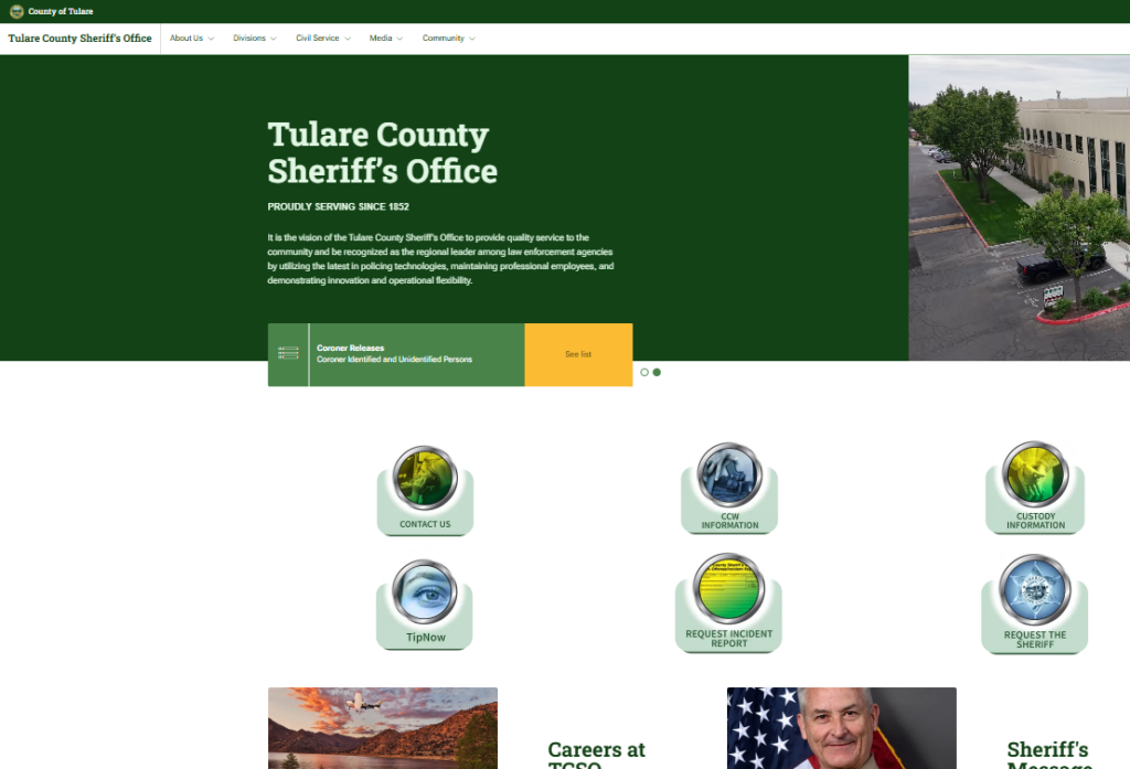 County sheriff offices, on the other hand, handle arrests made in unincorporated areas and oversee county jails. These offices manage county-level arrest records and custody information, including inmates held at county facilities. The Tulare County Sheriff’s Office and the Visalia Police Department maintain online portals and public record request systems that allow users to check law enforcement lookup information, such as active warrants, custody status, or recent bookings.